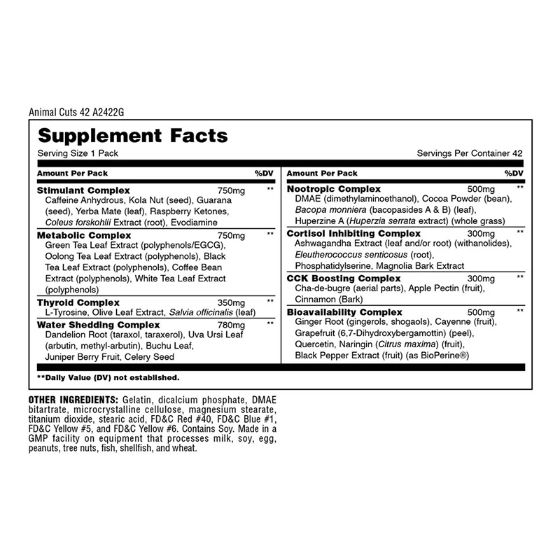 For bodybuilders, all the muscle in the world means little if it is shrouded by layers of bodyfat. There comes a time when what has been built and hard-earned through the heaviest weights and most intense training sessions, must be displayed to the world. There’s going to be some strict dieting on the horizon, some serious cardio in your future. But it might take something extra to deliver that grainy, striated look of etched musculature. That’s when you add Animal Cuts. More competitive bodybuilders whose careers depend on razor-sharp definition have turned to Animal Cuts than any other. The Animal Cuts formula is comprehensive. Think of it as everything you need, conveniently dosed in a single pack. You don’t have to think about anything. Just pop a ‘pack’ twice a day for three weeks and you’re set.