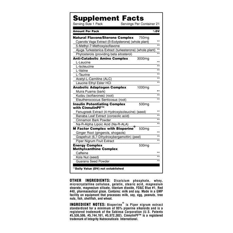 Now with new and even more powerful, Natural Flavone/Sterone Complex (including new Turkesterone), Anti-Catabolic Amino Complex (rich in leucine), Anabolic Adaptogen Complex (with safed musli and rosavins), Insulin Potentiating Complex (including colosolic acid and 4-hydroxyisoleucine among others), Energy Complex (as with Animal Pump, all the stims are in one red capsule for convenience and flexibility) and a new M-Factor Complex (with dihyroxybergmottin), the all-new Animal M-Stak is gonna blow the roof off the proven original.
