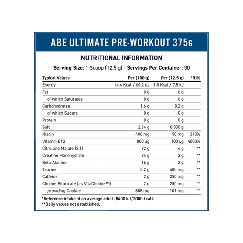 Each tub contains 390g (13.75oz) of ABE™ pre workout powder, giving you 30 servings per container.