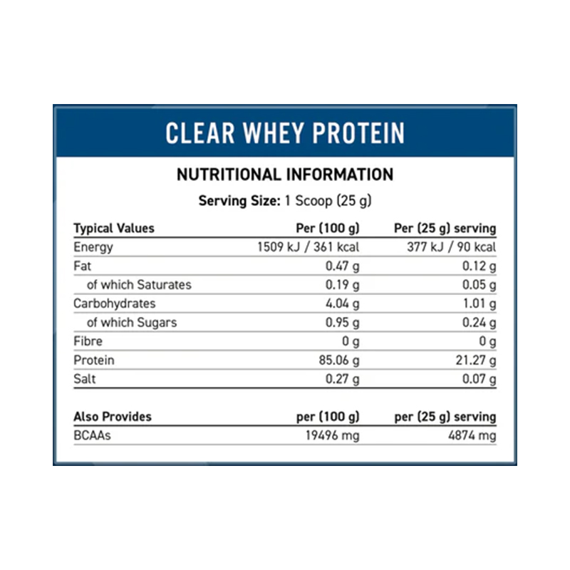 With all the key benefits of a normal protein shake, Clear Whey is absorbed rapidly and contains just 90 calories per 25g serving. It is packed with over 21g protein, has only 1g of carbs, and has less than 0.25g of sugar & fat.