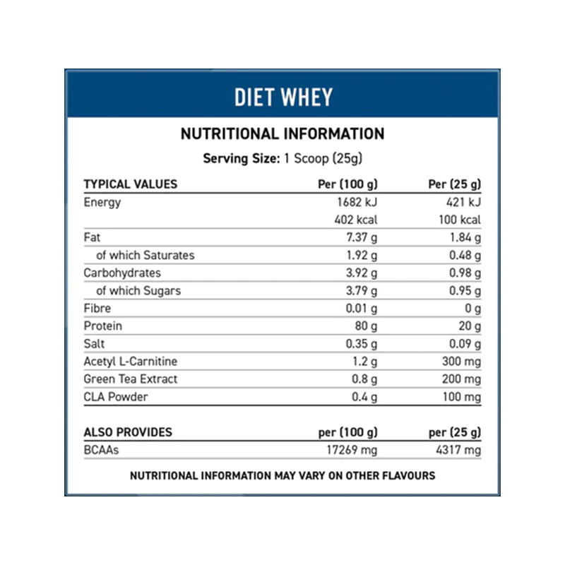 Diet Whey Protein is by far the most advanced weight management supplement available, combining all of the main ingredients which are currently known to contribute towards weight management including CLA, l-carnitine, green tea, whey protein isolate & whey protein concentrate resulting in a extremely low carb high protein blend.