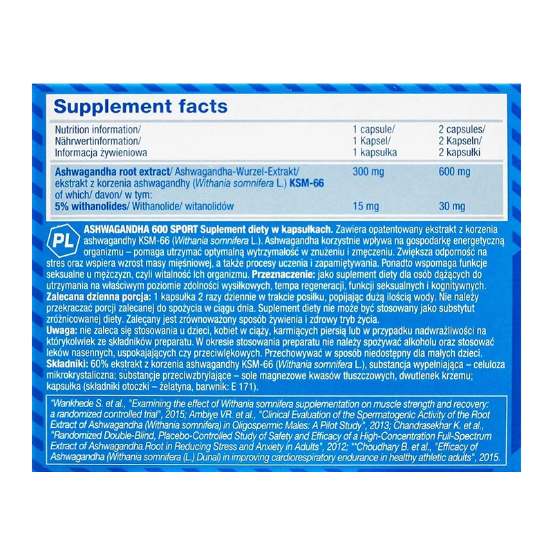 The unique extraction process of the patented KSM-66 form is based on the Green Chemistry principles – no alcohol or synthetic solvents – which has allowed obtaining a highly concentrated extract while maintaining all the natural components of the plant in its original proportions. In addition, the raw material used in the production of the Olimp Ahswagandha 600 Sport dietary supplement has been subjected to tests for the absence of hazardous heavy metals and to physicochemical analyzes in the modern Research and Development Center of the Olimp Laboratories pharmaceutical company. The company is exclusive for the use of the patented KSM-66 extract in their products in Poland. Undoubtedly, this is one of the company’s many advantages, and the preparation with the Olimp Sport Nutrition brand logo, containing the mentioned KSM-66 form, becomes unique on the Polish market! Do not forget about a healthy lifestyle and a balanced diet.
